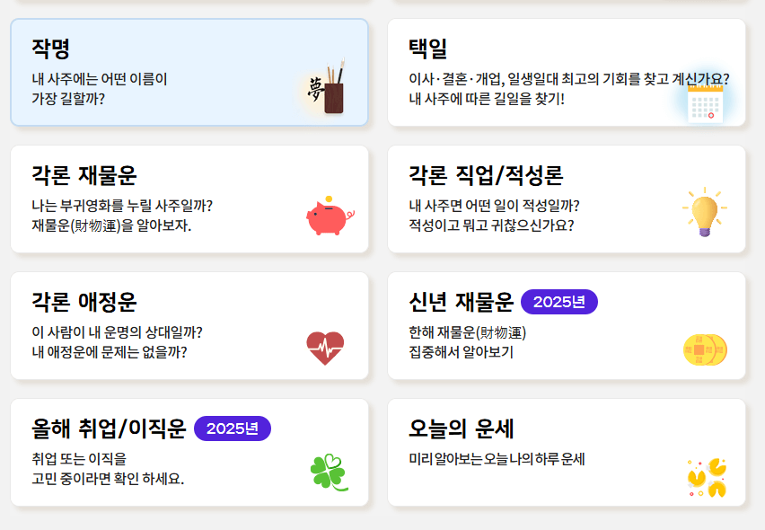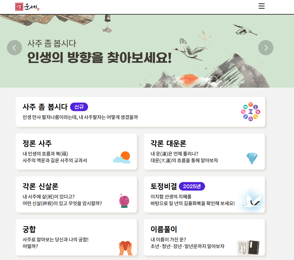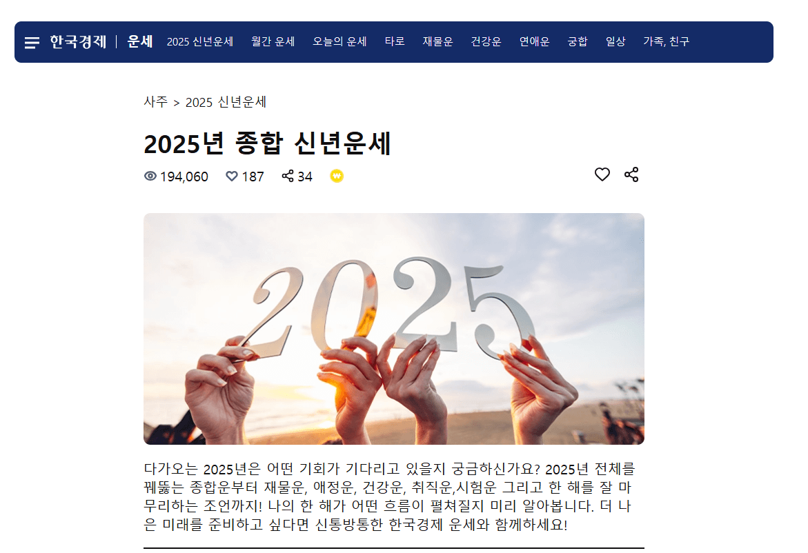 2025년은 특히 ‘균형’과 ‘성장’이라는 키워드가 중요한 해라고 합니다. 작지만 중요한 변화들이 쌓여 큰 성과로 이어질 가능성이 크다고 하니, 올해는 작은 노력도 소홀히 하지 않는 것이 중요합니다. 그래서 오늘은 나만의 운과 기회를 미리 확인하고, 한 해를 차근차근 준비할 수 있는 시간을 가져볼 수 있게 신년 운세 무료 사이트를 알려드리겠습니다. 무료 운세 보시고 2025년 새해 시작을 잘하실 수 있길 바랍니다.